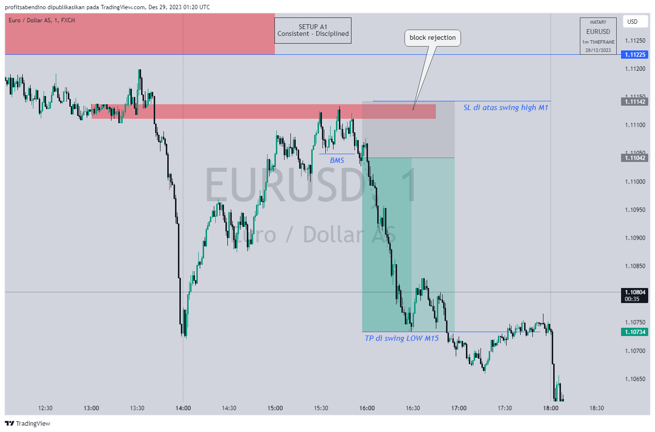 Setelah harga mencapai zona blok rejection, tunggu di time frame M1 untuk entri setelah adanya BMS di M1. Lakukan entri setelah Break.