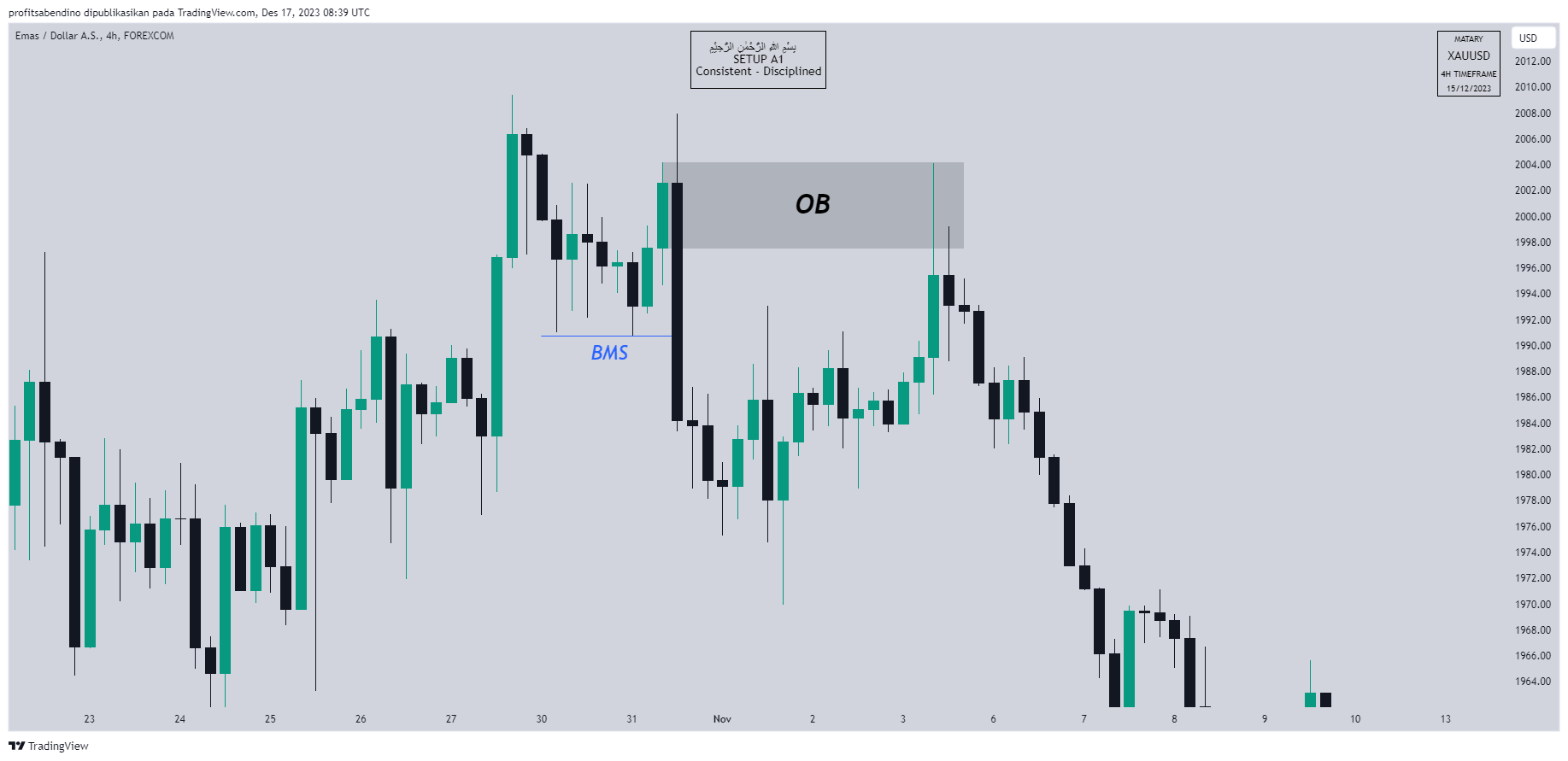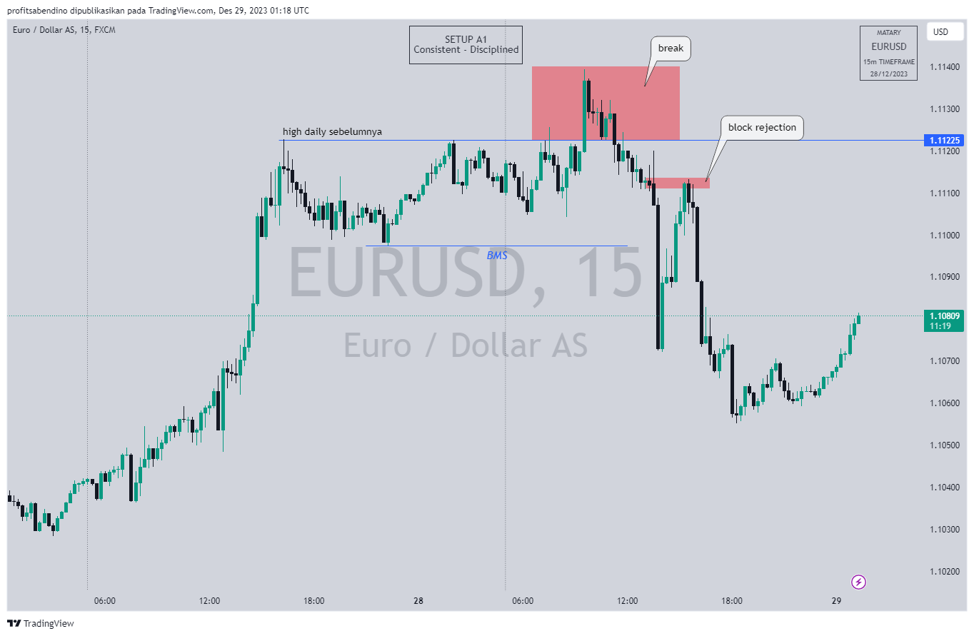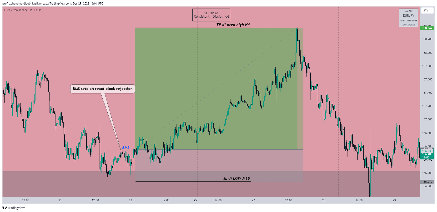 Setelah harga mencapai zona blok rejection, tunggu di time frame M15 untuk entri setelah adanya BMS di M15. Lakukan entri setelah Break.