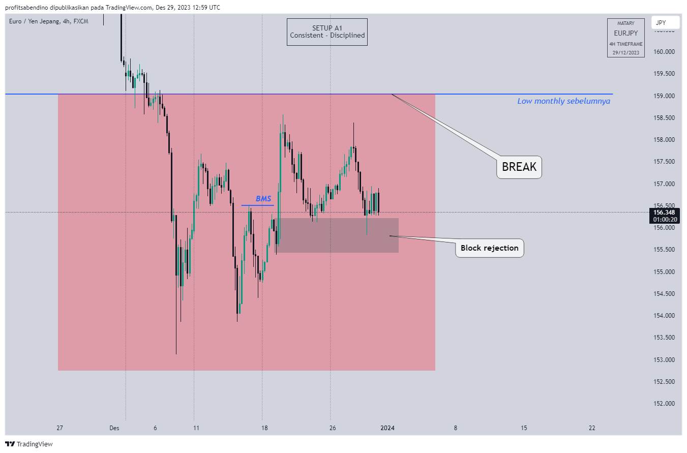 Untuk entri setelah BMS H4, tunggu harga di zona blok rejection yang telah di-marking