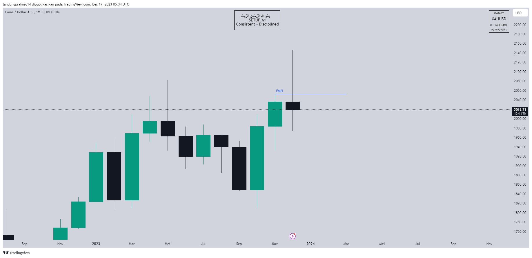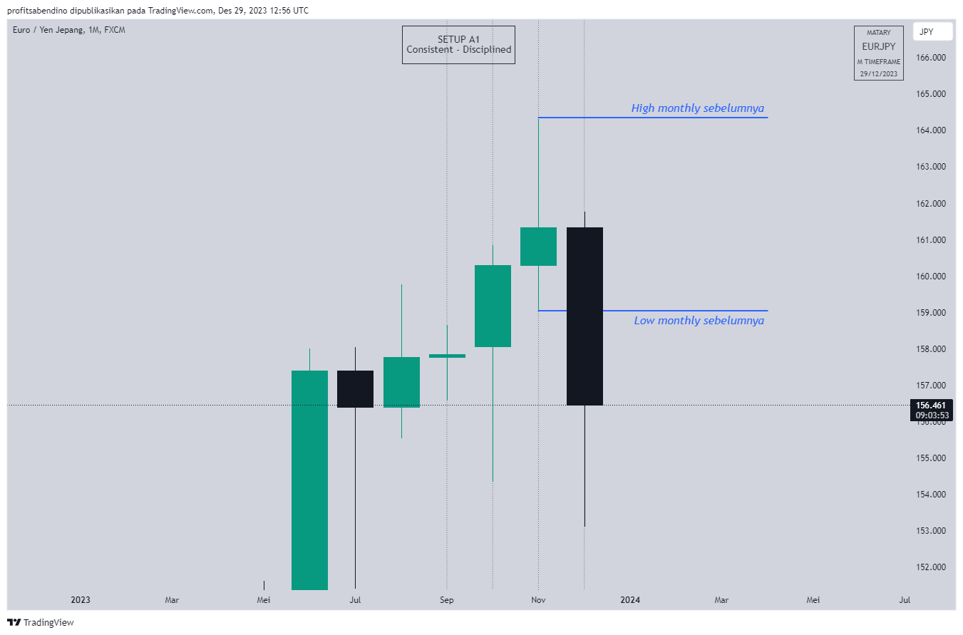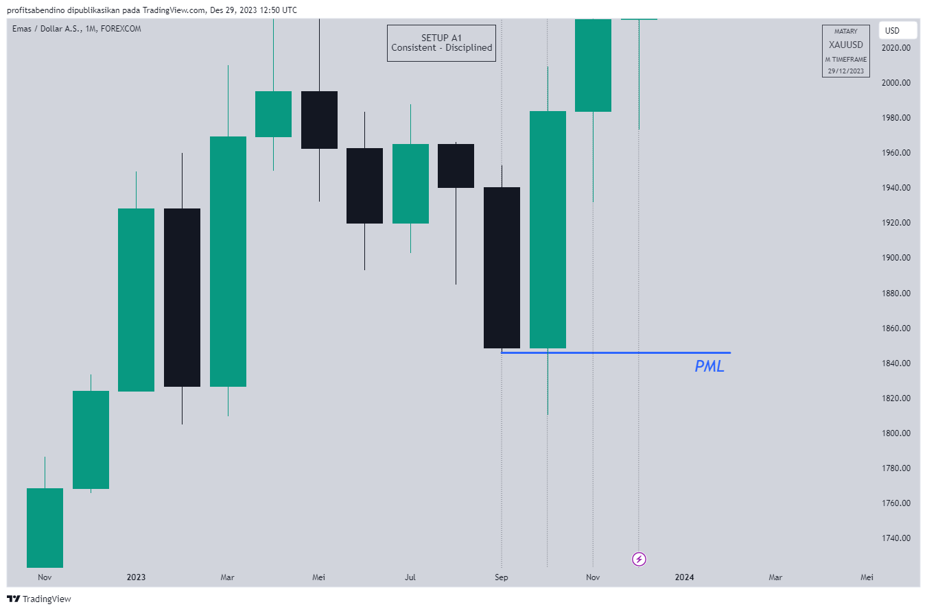 Mencari peluang entri Sell di atas swing high Monthly sebelumnya dan Buy di bawah Monthly sebelumnya.