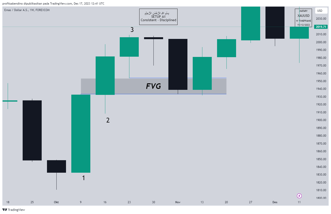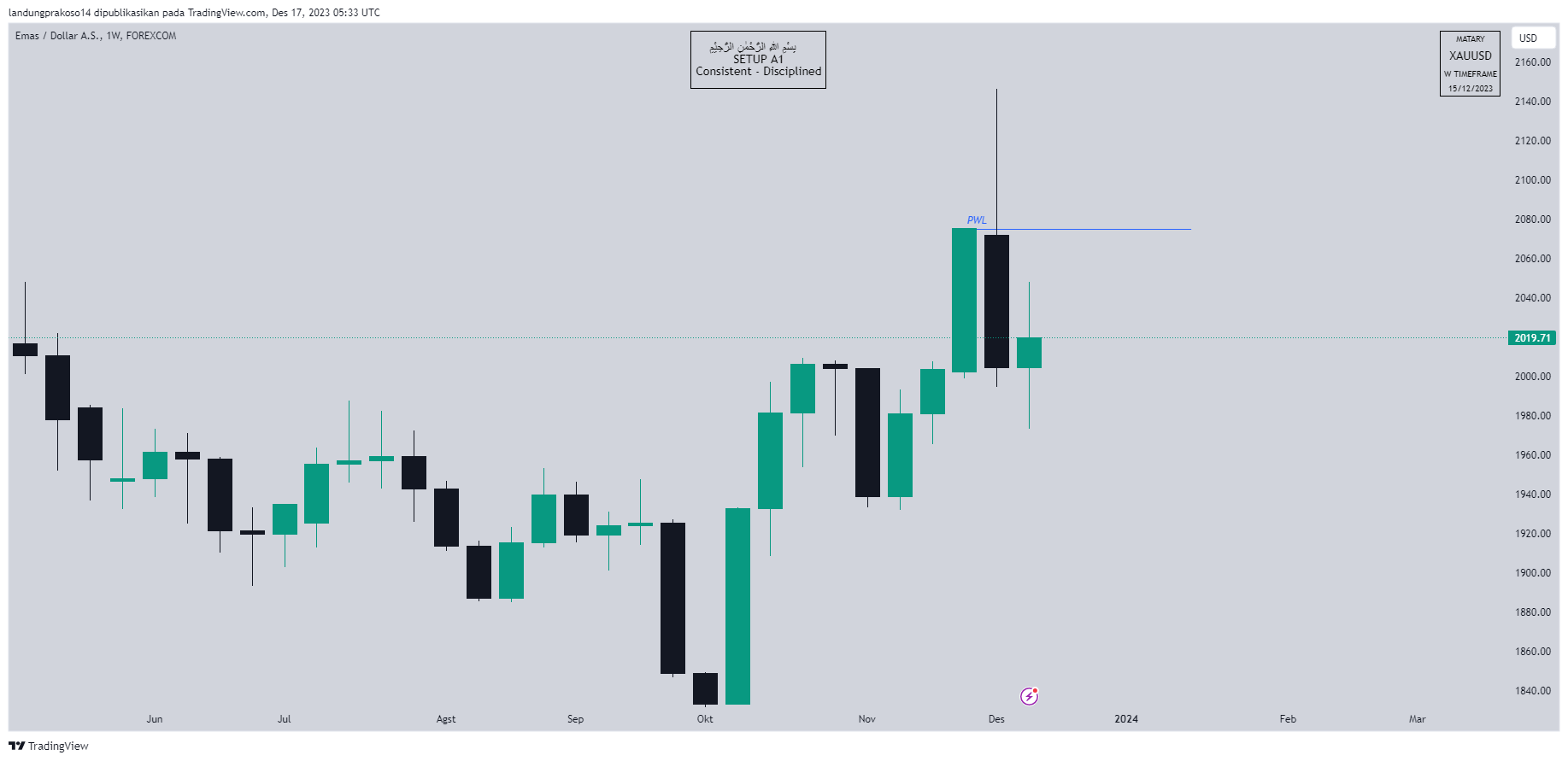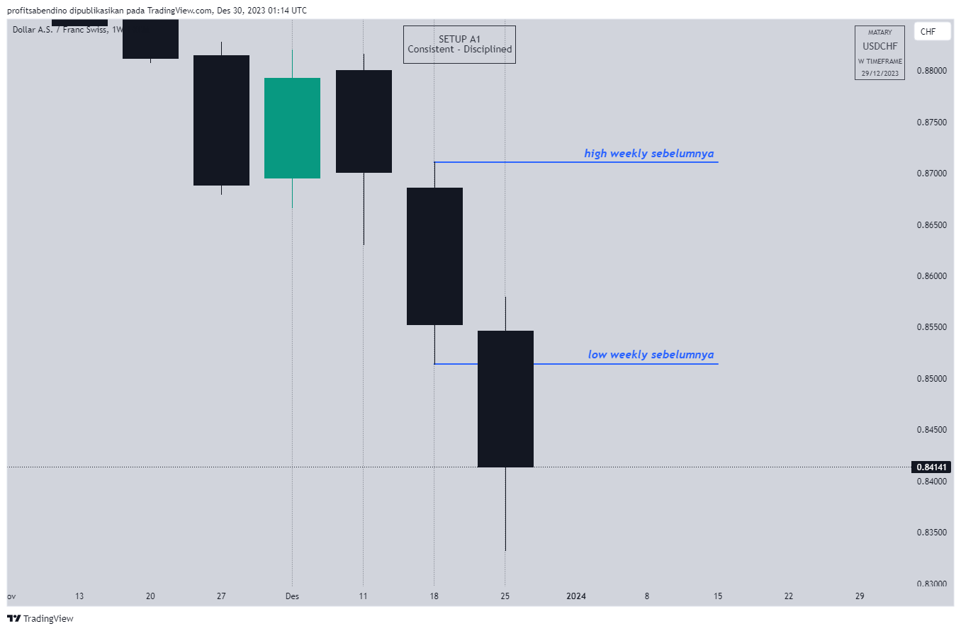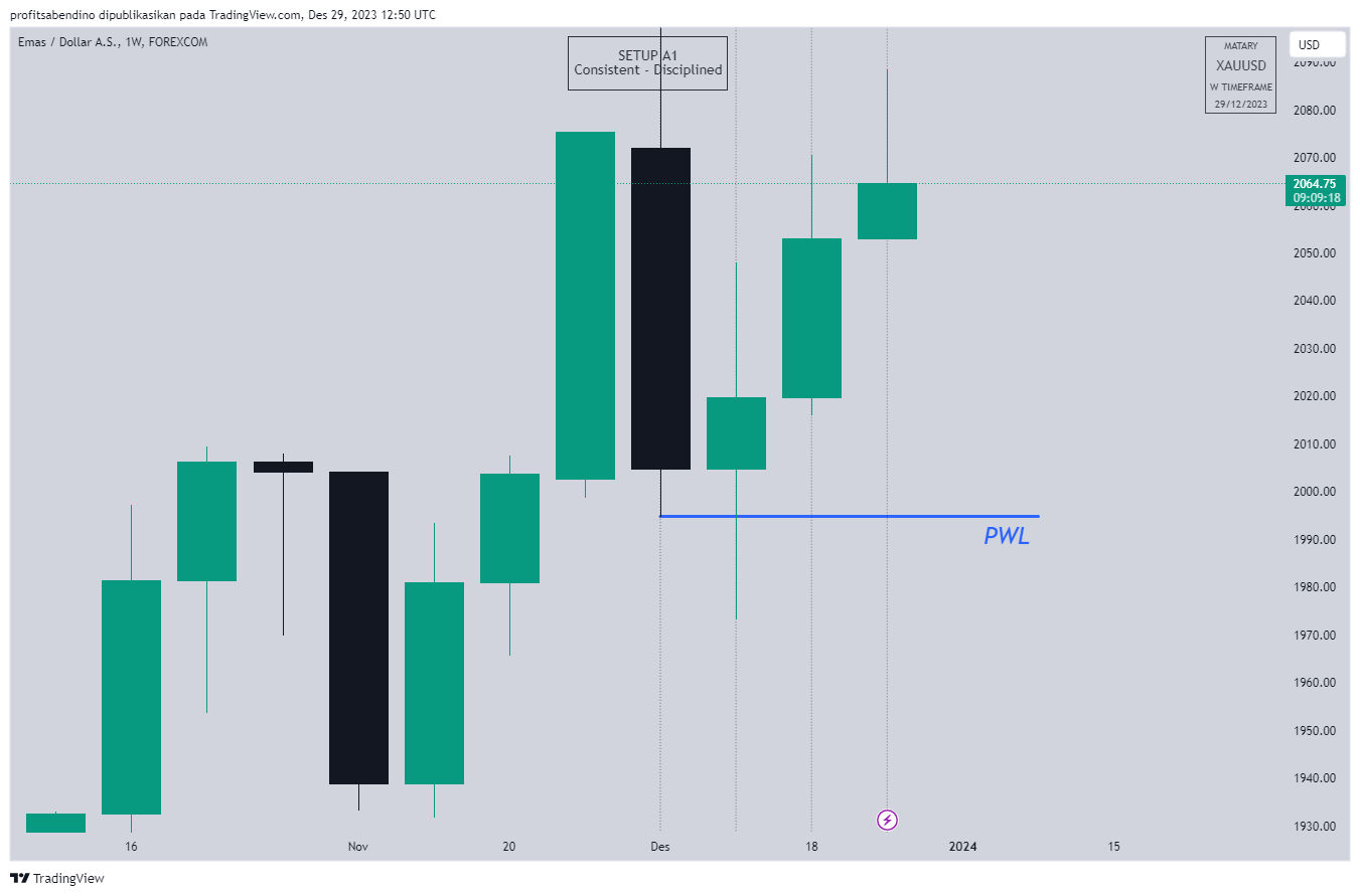 Mencari peluang entri Sell di atas swing high Weekly sebelumnya dan Buy di bawah Weekly sebelumnya.
