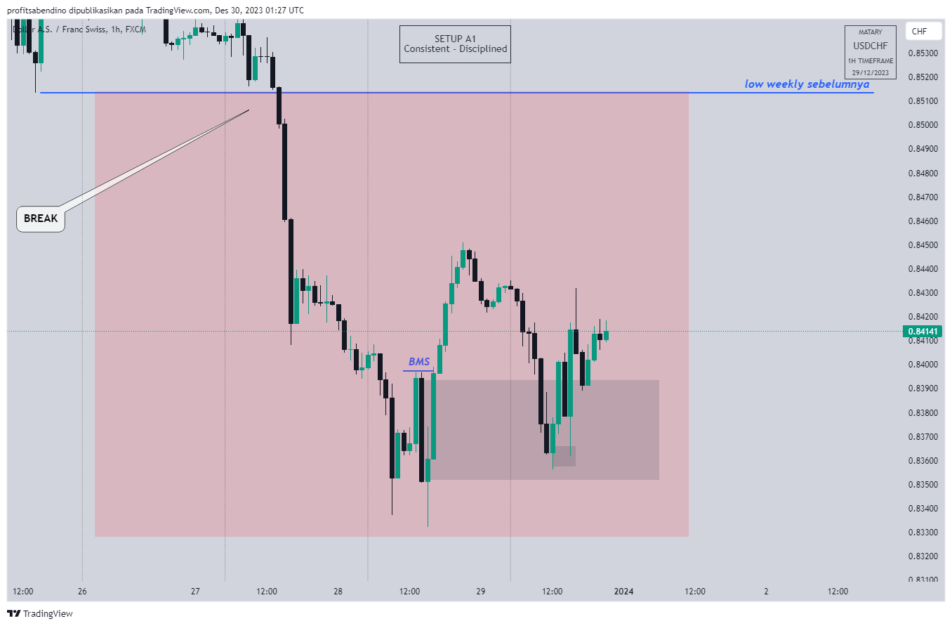 Jika swing high/low telah di-break, fokus mencari struktur market di time frame H1.