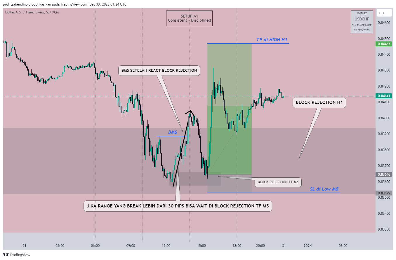 Setelah harga mencapai zona blok rejection, tunggu di time frame M5 untuk entri setelah adanya BMS di M5. Lakukan entri setelah Break.